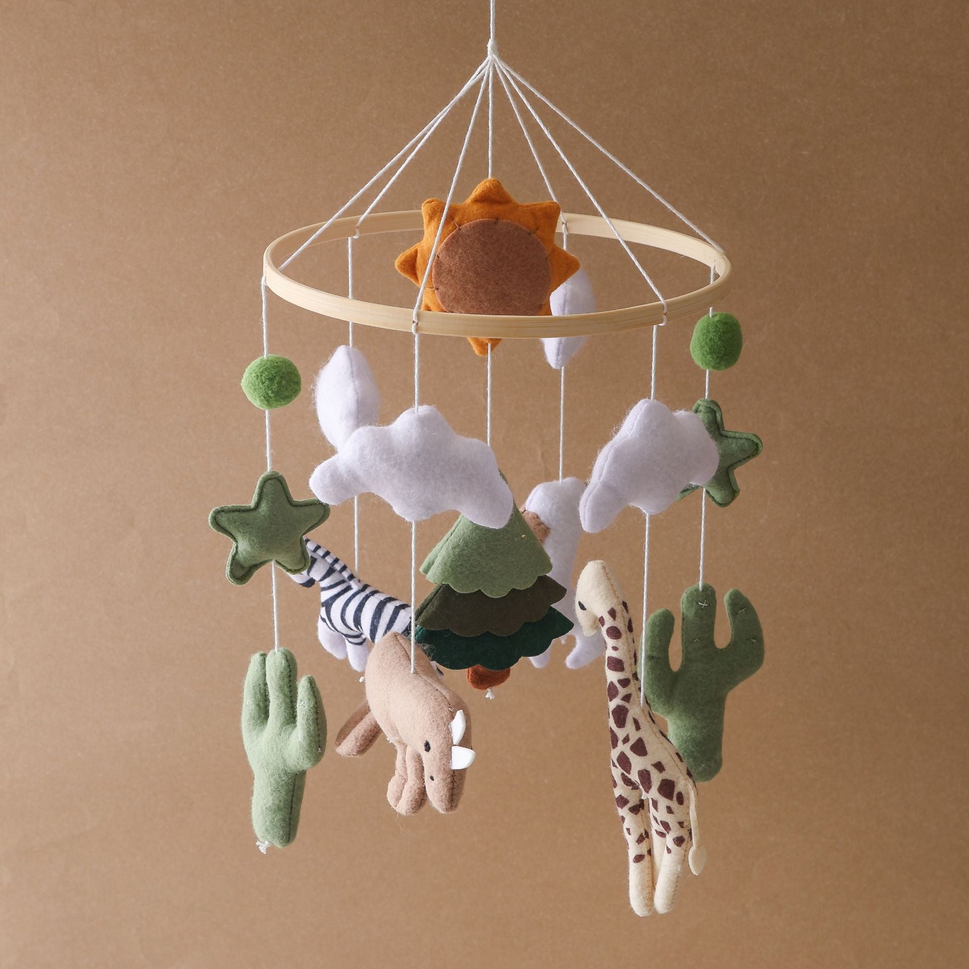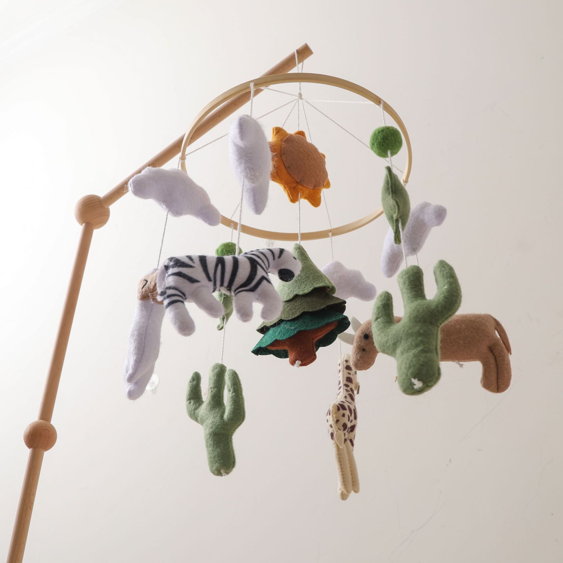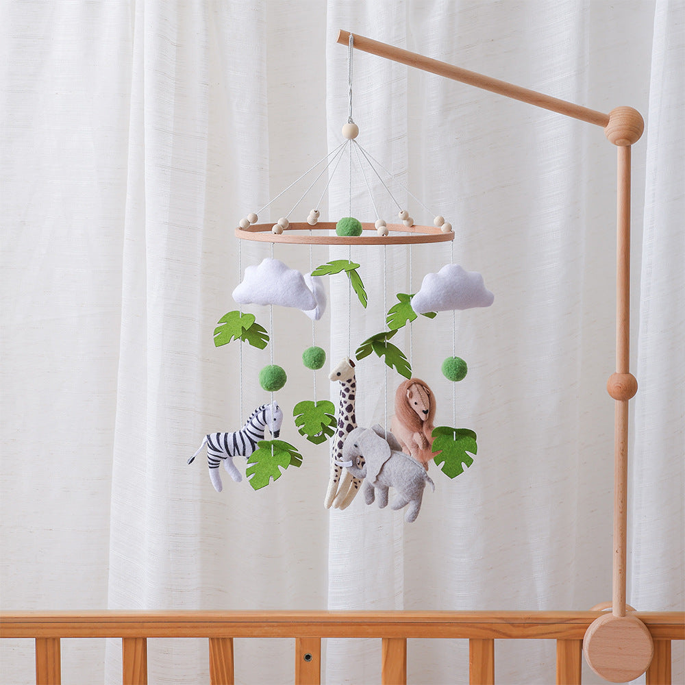 Watch their little eyes sparkle with curiosity. This handcrafted forest-themed crib mobile brings the gentle wonder of a tranquil forest into your baby's nursery. Elegant giraffes, playful zebras, and cuddly lambs twirl in the gentle breeze, becoming the focal point of your baby's daily visual exploration and infusing sleep and playtime with a sense of calming magic.