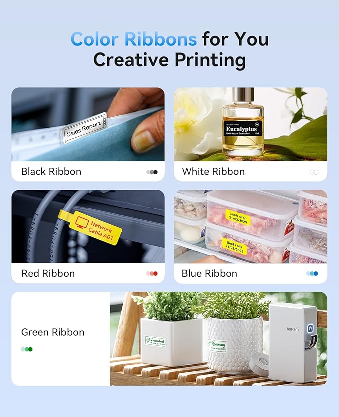 Support Printing with Color Ribbon: 5 colors of ribbon and more than 20 types of label paper you can choose, can be matched with the best printing results as you wish. It is great for price tags, personal item identification, food date marking, cable identification, and more. Make your home office more eye-catching and organized